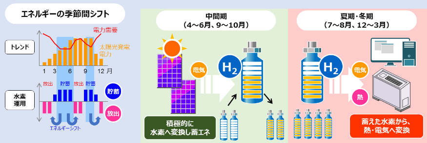 ・再エネ水素活用分散型蓄エネシステム:水素吸蔵合金を活用することで再エネ水素を蓄積するシステム。タンク容量の自由度が高く分散型システムとして利用可能。