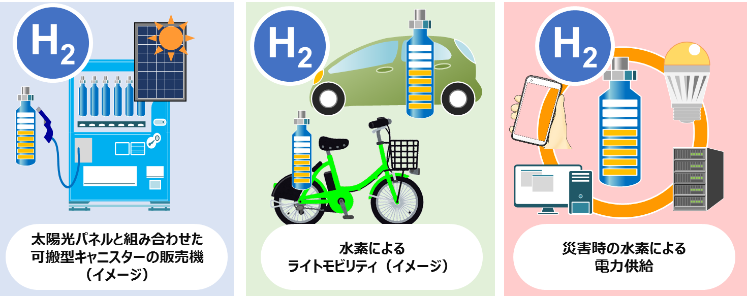 ・水素モビリティ:持ち運びが容易な可搬型水素キャニスターの活用。燃料電池を用いて、蓄積された再エネ水素を電気に変換することで、小型車両やキックボードなど移動動力として活用可能。