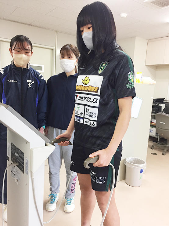 当日は、同大健康医療スポーツ学部医療スポーツ学科の学生が、アスレティックトレーナーの現場実習として機器の操作などを担当。普段の実習は学生を対象にすることが多いが、社会人選手に対して貴重な経験を得ることができた。