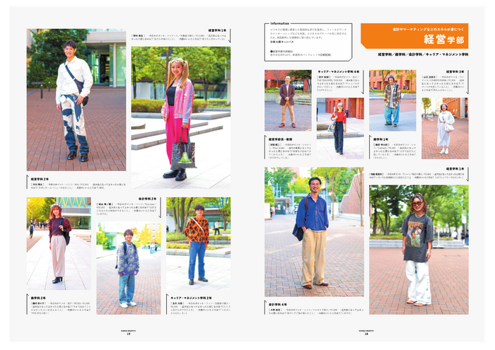 大学案内は通常、大学側が事前に依頼した学生への取材が中心ですが、本学では大学が見せたい姿ではなく、リアルなキャンパスの雰囲気を伝えるため、ストリートスナップを得意とする雑誌社とコラボして「ゲリラ取材」をメインとする大学案内を作成しています。この『TOKYO GRAFFITI』とのコラボは今回で9年目となり、編集スタッフが大阪に長期滞在して、半年間で全6キャンパス1,123人の学生を撮影しました。教育や研究内容、就職、留学など、情報はデータ集として巻末別冊に掲載しています。さらに16冊(15学部と短期大学部)の『学部案内』やWEBサイトからも詳しい情報を入手でき、志望校を検討中の受験生から志望校が決まっている受験生まで、それぞれのニーズに応えられる媒体を広く揃えています。