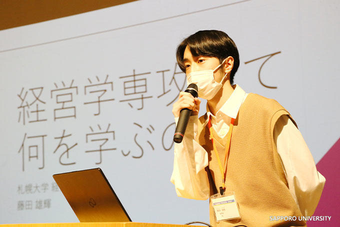 参加者はまず「ウェルカムガイダンス」で当日のスケジュールの説明を受けた。伊藤公紀副学長による歓迎の挨拶の後、とくに志望者が多い経済学・経営学・法学・英語の4つの専攻について、現役学生によるプレゼンテーションが行われた。さらに、4月から札幌大学に入学が決まっている高校3年生(サツダイ0年生)がゲストとして登壇し、志望動機や進路選択などを中心とした体験談を披露した。