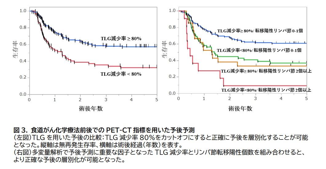 226人の食道がん患者のデータを解析した結果、化学療法前後でTLG値(中央値)は96.3から4.5に明らかに減少しており、化学療法によるがんの縮小が確認されました。このTLG減少率と手術後の予後との関係をみると、TLG減少率80%を境界として予後が最も大きく分かれることが判明したため、これを独自のカットオフ値として設定しました。これを指標として、TLG減少率が大きいケース(80%以上、がんが一定以上縮小した群)は、小さいケース(80%未満、がんがあまり縮小しなかった群)と比較して、予後(無再発生存率)が明らかに良いことがわかりました(図3 左図)。