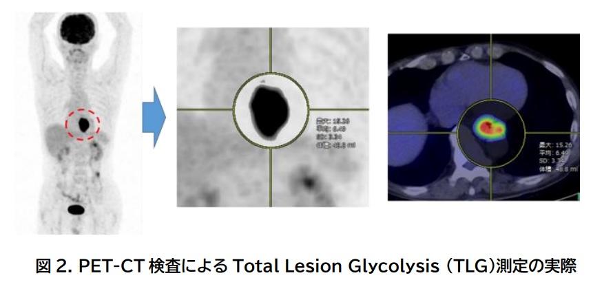 ◆食道がんの抗がん剤投与前後の(FDG)PET-CT検査において、腫瘍の糖代謝と腫瘍体積を合わせた総糖代謝量(Total Lesion Glycolysis: TLG)という指標を用いて、抗がん剤によるがんの減少率を正確に測定することが可能となった。