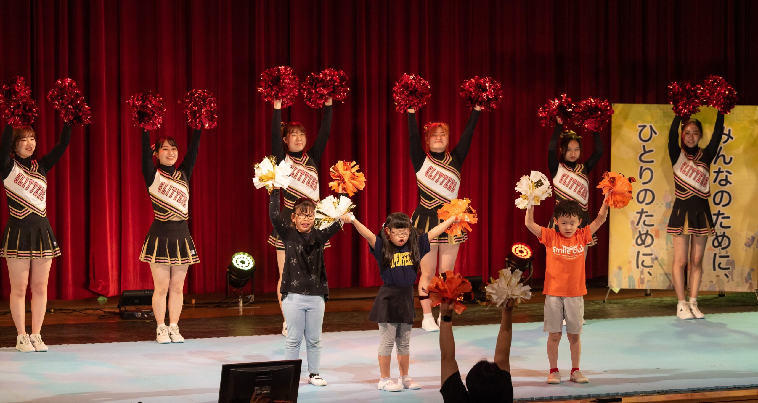 流経大の新松戸キャンパス2号館では、知的障がいがある子どもたちを対象にしたチアリーディング体験会を2022年6月から毎月実施し、同年10月に開かれた「地域共生シンポジウム(松戸市共催)」では、流経大チアリーディング部GLITTERS(グリッターズ)と子どもたちが初コラボして演技を披露しました。
