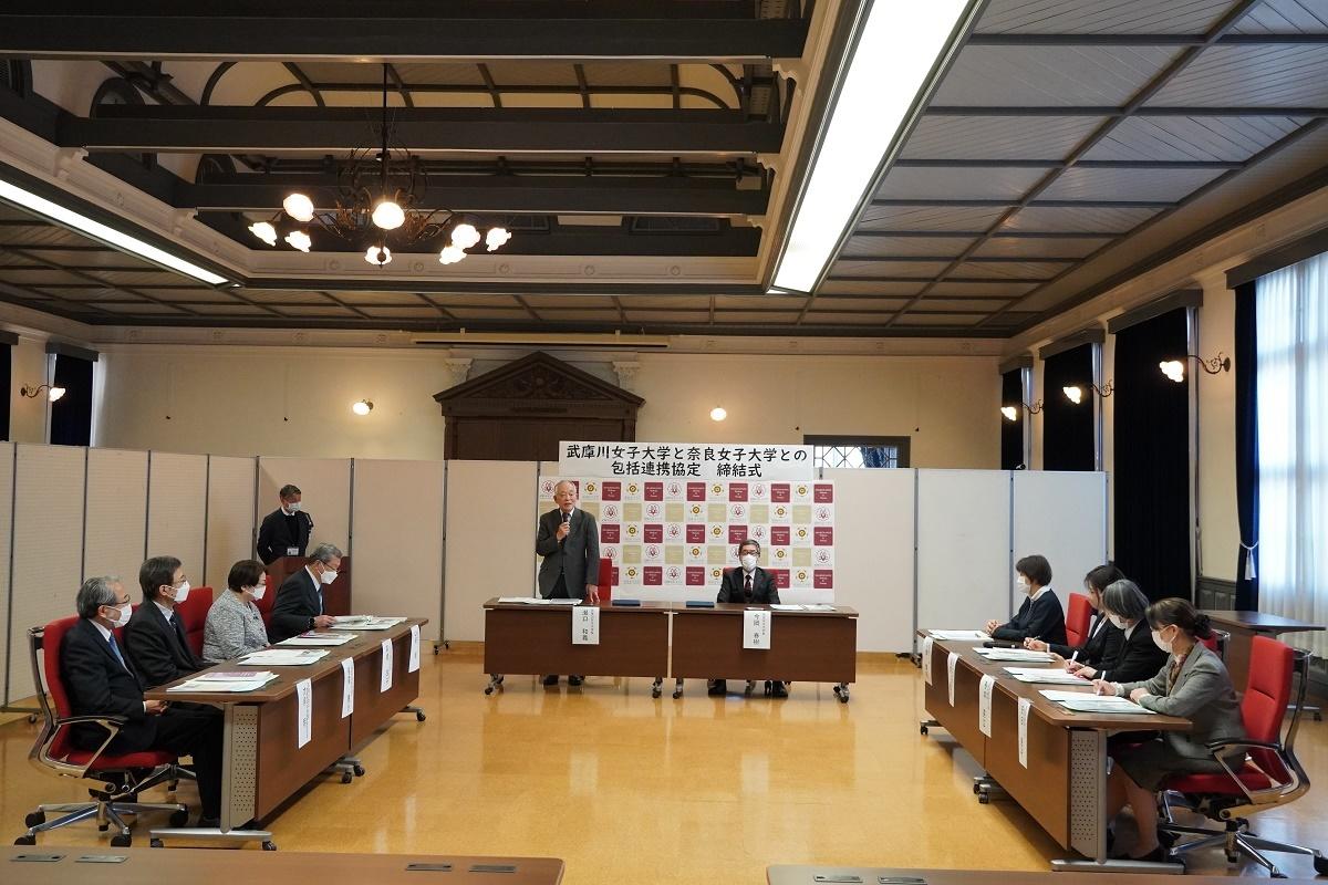 締結式は、奈良市の奈良女子大学記念館で行われ、奈良女子大学の今岡春樹学長と武庫川女子大学の瀬口和義学長が協定書に署名を行いました。