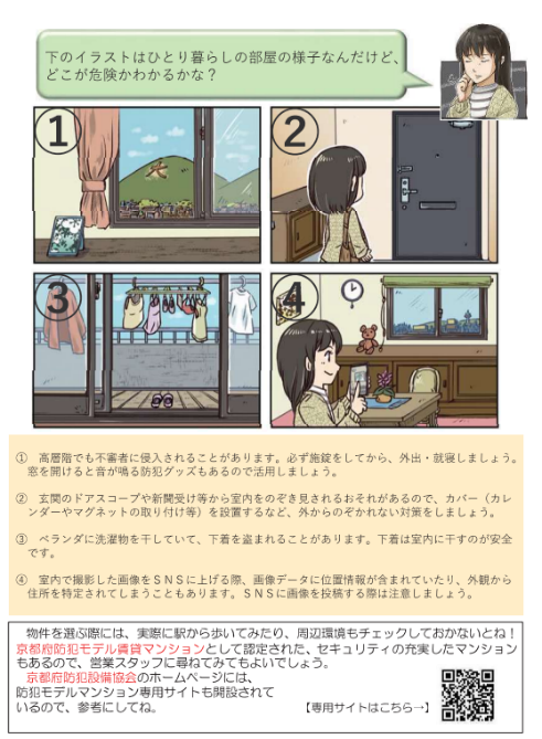 また、調査・研究の成果物として京都市・京都府警本部監修の下、「性犯罪被害防止ハンドブック #ひとり暮らし」を制作。日常生活の中でひとり暮らしの女性が性犯罪被害に遭う危険性を、室内・室外に分けイラストや写真を用いて事例を網羅し、安心安全に役立つ情報(悩んだ時の相談先など)を掲載している。