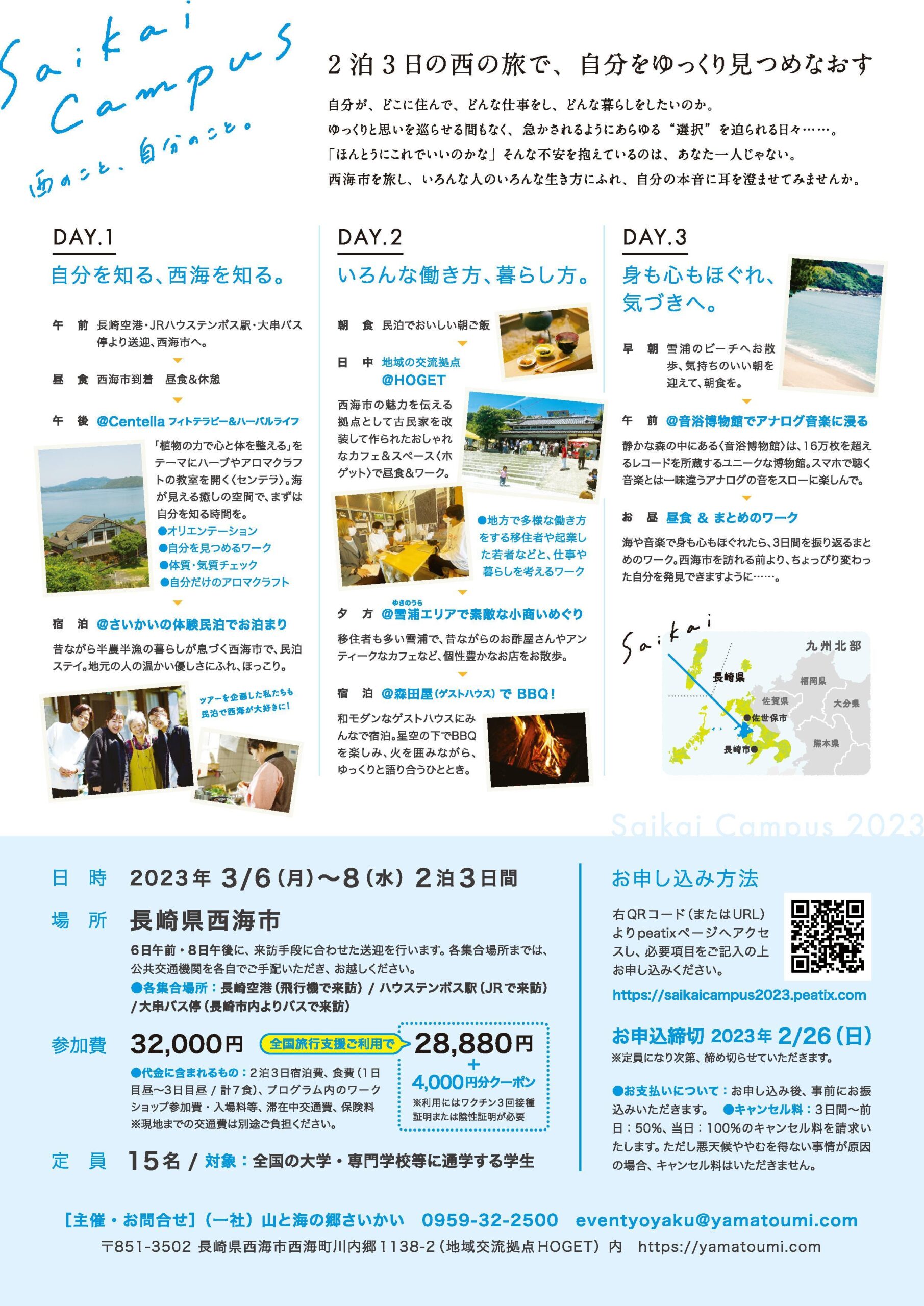 都会では競争になる事業も、地方では新しいアイデアになり、挑戦しやすい。都会ではお金やネットに依存しているけど、地方にはどんな時にでも生き抜ける知恵や人々とのつながりがある。そんな”気づき”を伝えるために、私たちは今回のスタディツアーを企画しました。山、海、豊かな自然に囲まれた西のはしっこ・西海市は、きっとみなさんの、第二の故郷のような居場所になるはず。