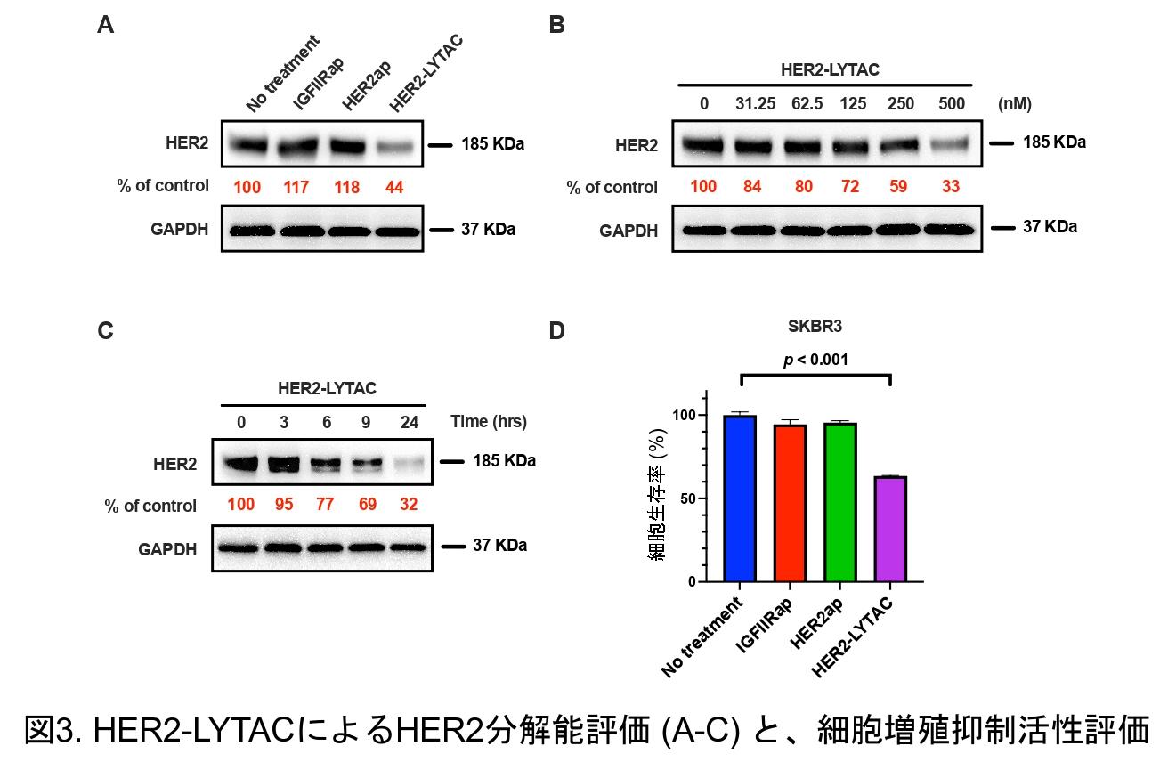 以上の結果から、HER2-LYTACは、HER2陽性癌に対するこれまでにない新たな作用機序を有する抗がん剤として、有用であることが強く示唆されました。