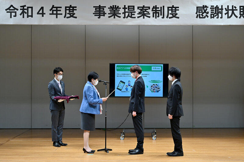 2023年2月7日、東京都庁で行われた「令和4年度事業提案制度感謝状贈呈式」において、本事業を提案した学生が小池百合子東京都知事より感謝状と記念品の贈呈を受けました。(画像2~5 参照)