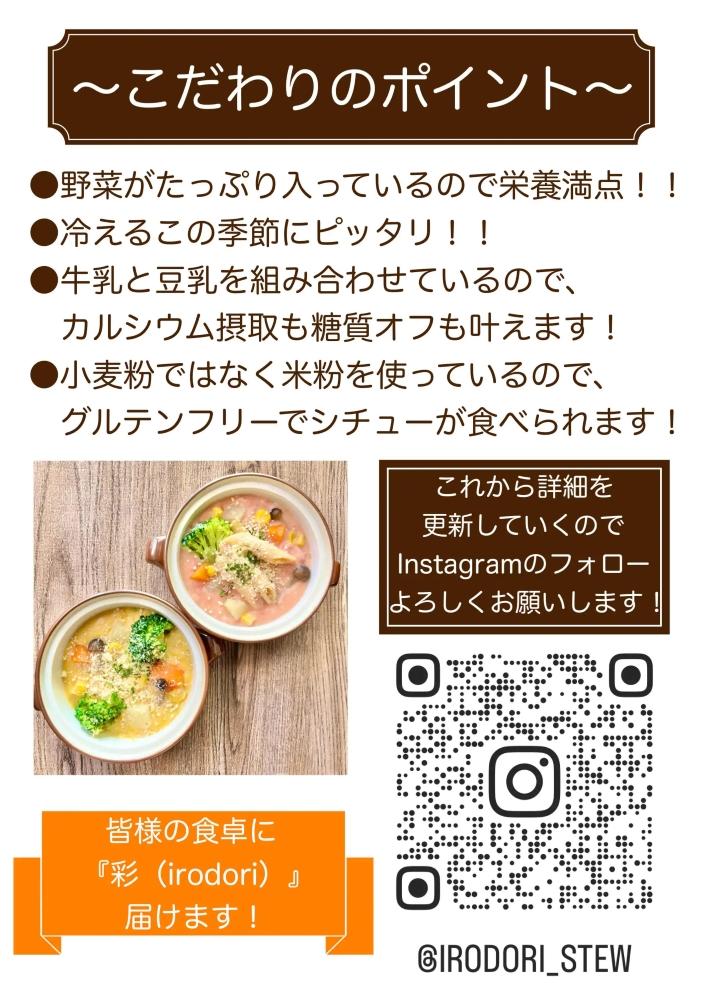 主なメニューである4種類のクリームシチューとロールキャベツの他、コンソメスープなどもあり、さまざまなトッピングによってアレンジを楽しむこともできる。牛乳と豆乳を組み合わせて作ったシチューはカルシウムと鉄分を摂取できるが糖質は控えめで、小麦粉ではなく米粉を使っており、グルテンフリー。野菜もたっぷり入った栄養満点のメニューとなっている。