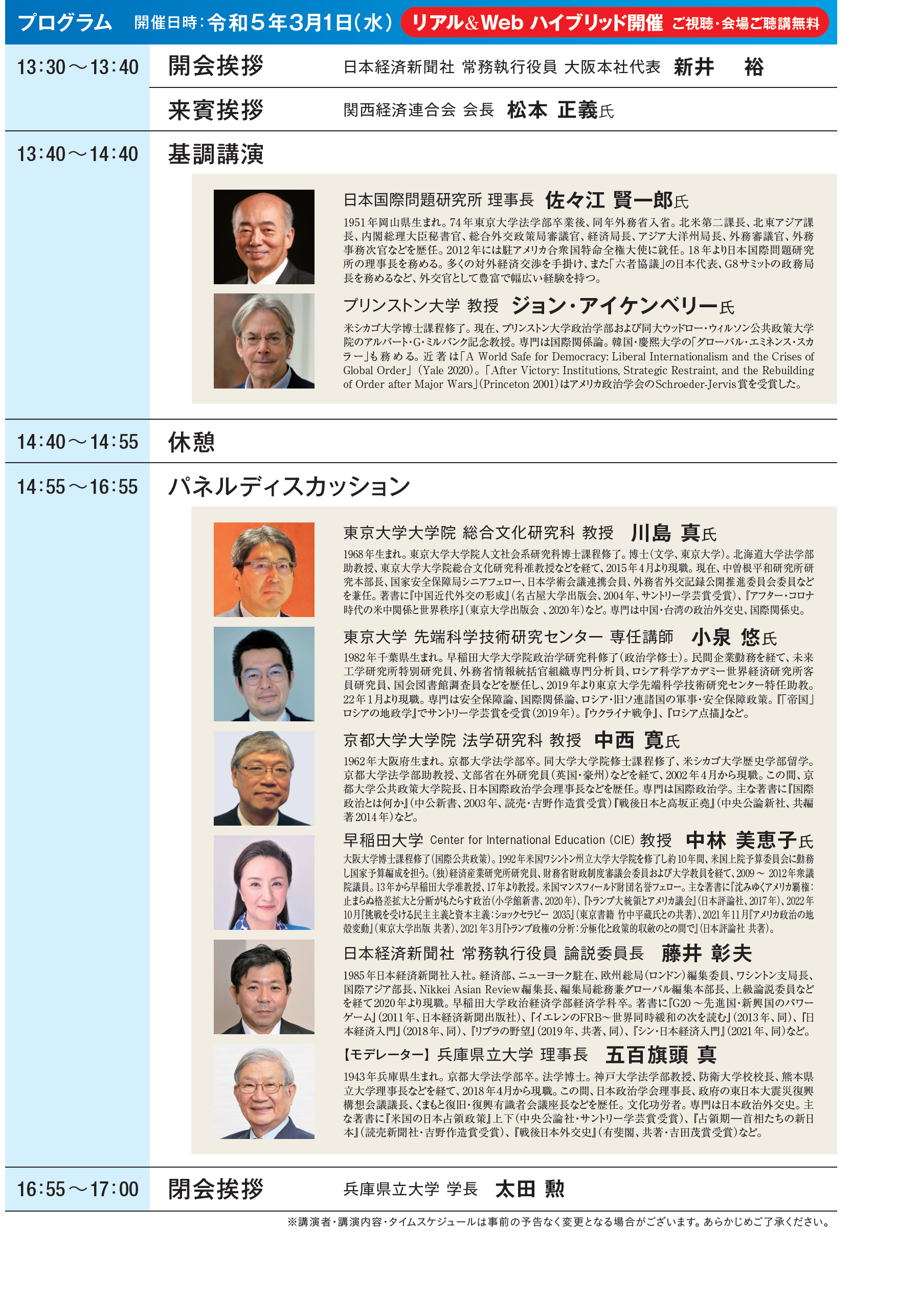 このたびのシンポジウムでは、こうした世界の動きを踏まえ、国際秩序の行方や日本の役割について第一線の識者が熱く論じ、その模様を大阪から発信。日本国際問題研究所の佐々江賢一郎理事長、プリンストン大学のジョン・アイケンベリー教授による基調講演のほか、兵庫県立大学の五百旗頭真理事長がコーディネーターを務めるパネルディスカッションが行われる。概要は以下の通り。