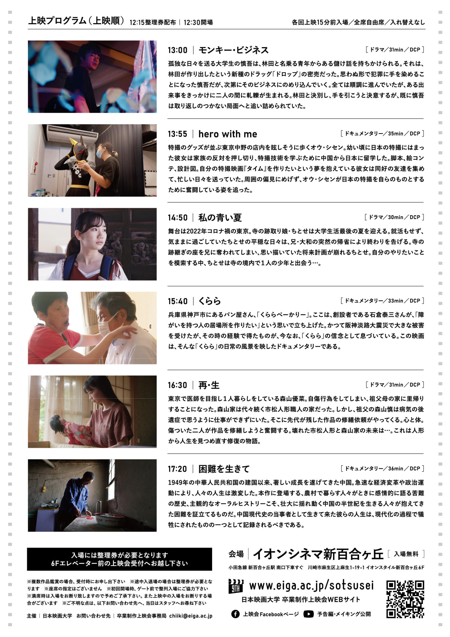 日本映画大学は例年、イオンシネマ新百合ヶ丘で「卒業制作上映会」を実施している。昨年と一昨年は新型コロナウイルス感染拡大の状況から一般公開を断念したが、今年度は3年ぶりに一般の観客を迎えて開催。ドラマ作品『モンキー・ビジネス』『私の青い夏』『再・生』、ドキュメンタリー作品『hero with me』『くらら』『困難を生きて』の計6作品を上映する。