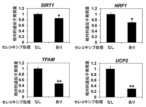 [図2] セレコキシブによるミトコンドリア生合成遺伝子の発現への影響:セレコキシブを終濃度70μMで24時間処理をしたところ、ミトコンドリア生合成関連遺伝子の発現量が未処理の状態と比較して低下