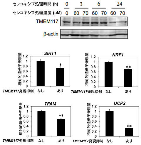 本研究室では、これまでの研究でミトコンドリア膜電位の消失を介した細胞死を誘導するshRNA配列を取得し、その標的遺伝子としてTMEM117を同定しています。そこで、この発現量への影響を調べた結果、セレコキシブの処理によりTMEM117の発現量は減少しました。また、上述のミトコンドリア生合成に関連する遺伝子の発現量がTMEM117遺伝子の発現を抑制した場合でも低下しました(図3)。以上の結果から、セレコキシブによるミトコンドリア膜電位の消失は、TMEM117の発現低下を介したミトコンドリア生合成に重要な遺伝子の発現抑制によって引き起こされることが示唆されました。