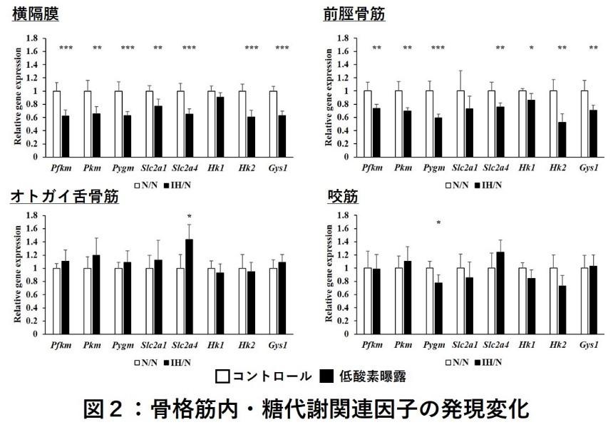 ・一方、オトガイ舌骨筋や咬筋ではこれらの変化は認められなかったことから、胎児期の低酸素曝露による骨格筋への影響は部位特異性があることが考えられた。