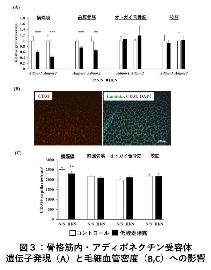 ・横隔膜や前脛骨筋では毛細血管密度が低下しており、アディポネクチン受容体の発現低下の関与が示唆された。
