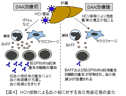 C型肝炎では肝細胞や肝臓内の樹状細胞から産生されたIFN-α/β、IFN-γなどの炎症性サイトカインがHCV排除に関与し、これらのサイトカインは単球やマクロファージに作用し、BAFFの産生を誘導することが知られています。このことから、DAA治療によるHCV排除が炎症性サイトカインの産生を抑制し、それに伴うBAFFの正常化により自己反応性B細胞が減少し、血小板減少が改善された可能性が推察されます【図4】。