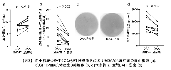 さらに、血小板減少を伴うC型慢性肝炎の血漿BAFF濃度は、DAA治療により減少し 【図3d】、血漿BAFF濃度と抗 GPIIb/IIIa 抗体産生 B 細胞数は正の相関関係を示しました。これらの結果は、DAA治療が血小板に対する自己免疫反応を抑制し、血小板減少を改善することを示唆しています。