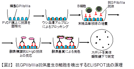 本研究では、DAAで8〜12週間治療を行い、治療後にHCV RNAが陰性となったC型慢性肝炎患者を対象としました。DAA治療前後の検体を用いて、血小板減少に関与する自己抗体 (抗GPIIb/IIIa抗体) を産生するB細胞数の変化、血漿BAFFや増殖誘導リガンド (APRIL)、IL-21、TPOの濃度の変化を測定しました。抗GPIIb/IIIa抗体産生B細胞数の測定はELISPOT法 (Enzyme-linked immunospot) を用いました【図2】。