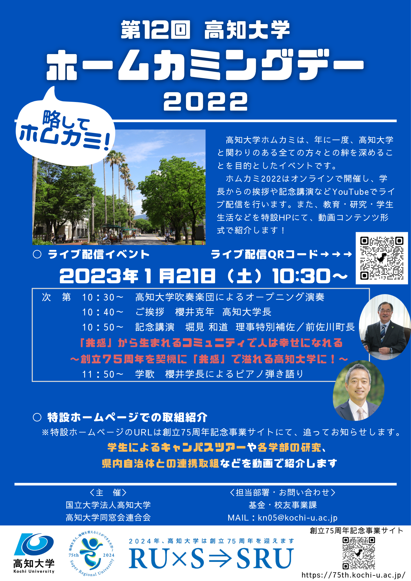 今年度開催の高知大学ホームカミングデー(ホムカミ)では、次期NHK連続テレビ小説「らんまん」の誘致を朝ドラ牧野の会会長として牽引された高知県佐川町の前町長である高知大学理事特別補佐の堀見和道氏による記念講演や、高知大学・櫻井克年学長による高知大学学歌のピアノ弾き語りをYouTubeでライブ配信(URL: https://youtu.be/Jy99zPGALlQ)します。