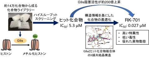 共同研究グループは、まず約14万の化合物からG9a阻害活性を持つ化合物の探索を目的としたハイスループットスクリーニングを行いました。得られたヒット化合物とG9aの複合体の構造情報を基に化合物の最適化を行い、G9a阻害活性がヒット化合物よりも約200倍も高い「RK-701」の開発に成功しました(図1)。