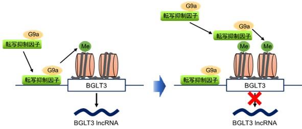 次に、RK-701を用いて、G9aによる胎児型γグロビン遺伝子の発現抑制機構を調べました。RK-701により発現が増加する遺伝子を網羅的に調べたところ、数ある胎児型γグロビン発現制御因子の中で、BGLT3遺伝子の発現だけが非常に増加していることが分かりました。BGLT3は、胎児型γグロビン発現誘導活性を持つ長鎖ノンコーディングRNA(IncRNA)です。細胞内のBGLT3(BGLT3 lncRNA)の発現を低下させると、RK-701による胎児型γグロビンの発現誘導がほぼ完全に抑制されました(図2右上)。これらの結果から、G9aによる胎児型γグロビン遺伝子の発現抑制にBGLT3が重要な役割を果たしていることが分かりました(図2)。