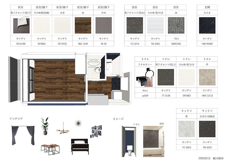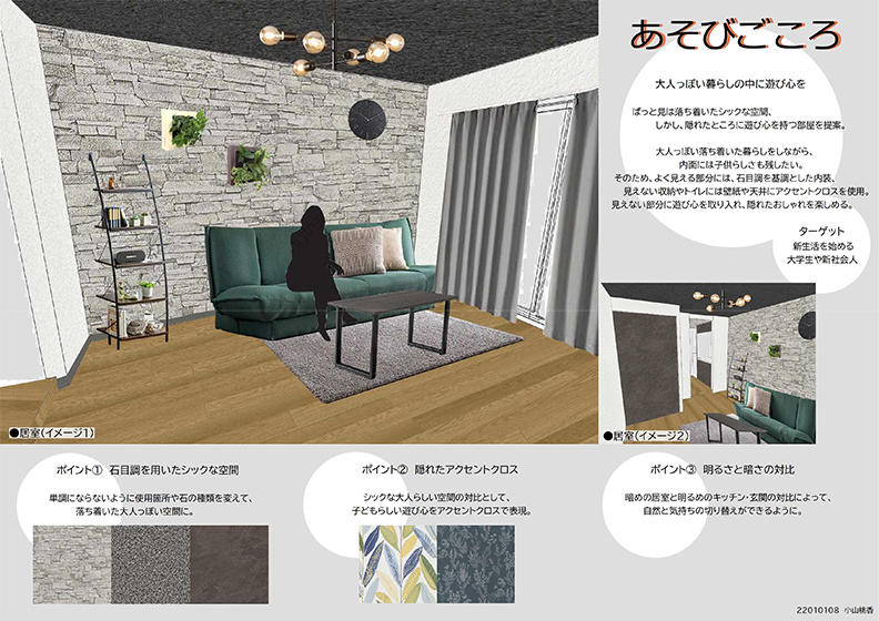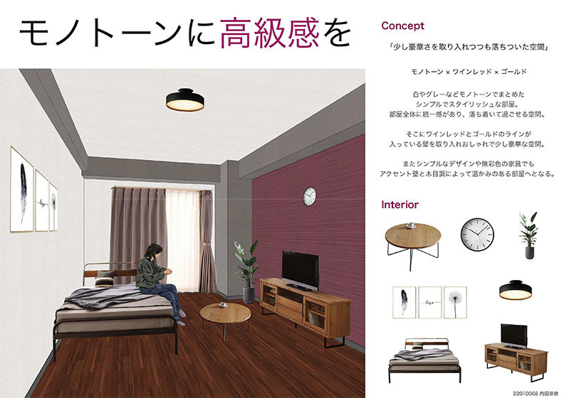 12月のプレゼンテーション作品の中から、最優秀賞1名・優秀賞2名・佳作3名を選出して表彰。今後は内装全体のリニューアル計画をデザイン・パッケージとしてまとめ、株式会社東都の協力のもと、賃貸住宅のオーナーへ提示する。