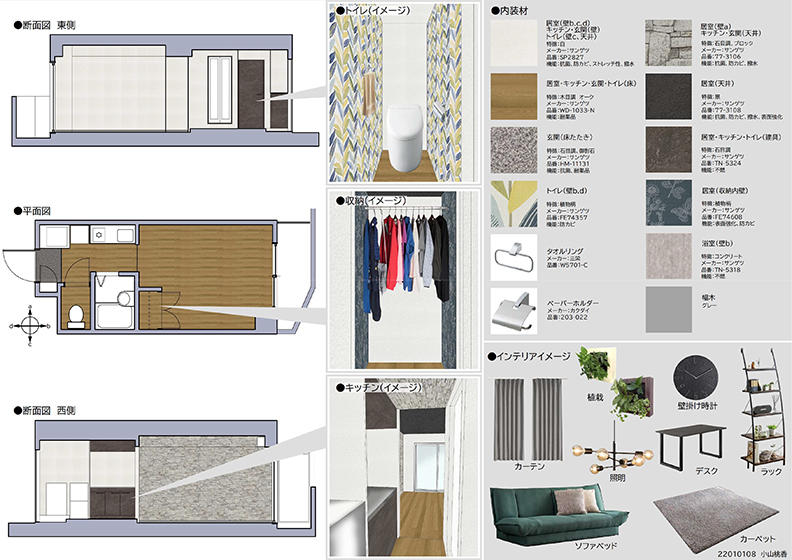 今年度は、賃貸住宅の中でも戸数の多い、一人暮らし向け1Kタイプ(1室+キッチン+ユニットバスによる住戸タイプ)を想定した内装スタイルのリフォームを課題とした。現在は、受賞学生6名が実際の空間実現に向けてオーナー向けパンフレットの制作などに取り組んでいる。