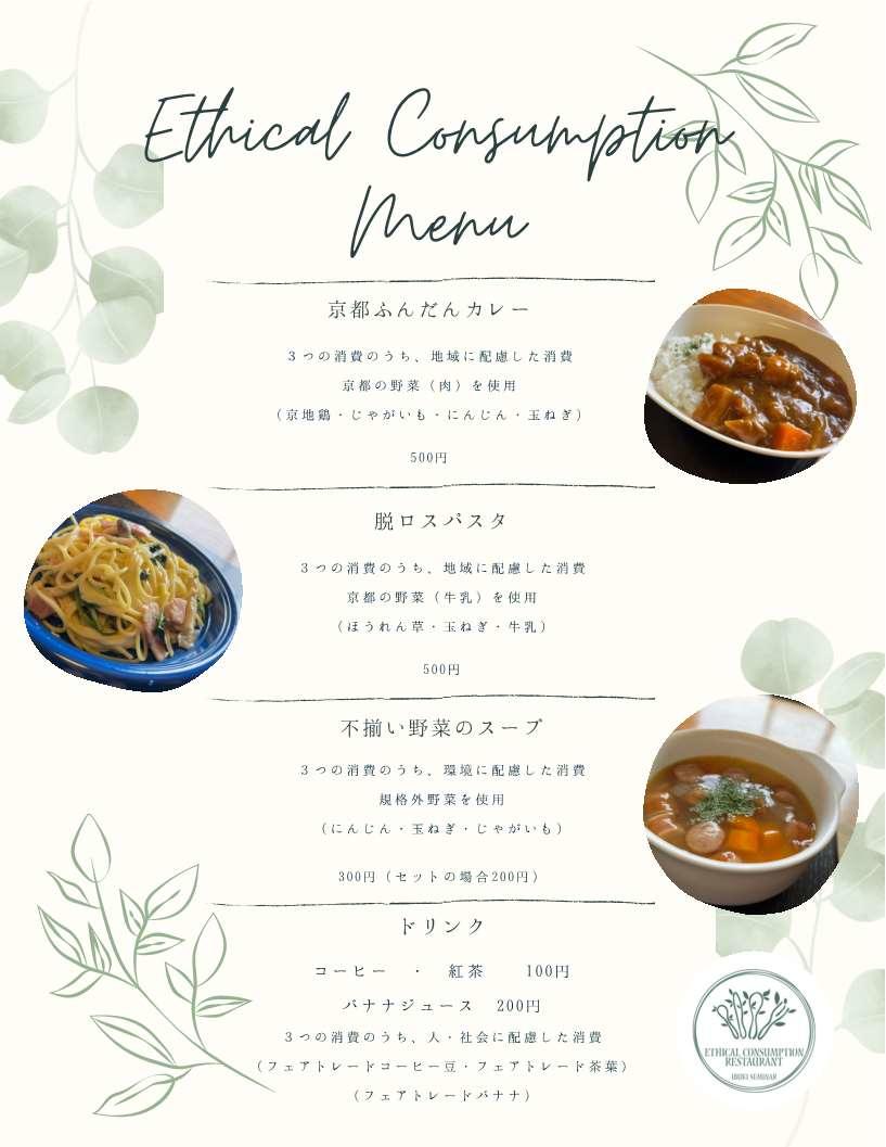 エシカル消費レストランにて提供するメニューの材料は地産地消の野菜類、フェアトレードのコーヒー豆や紅茶の茶葉を使用するなどし、身近な「食」から「エシカル消費」を意識してもらうことを目標に、2023年1月14日(土)15日(日)の2日間実地する。