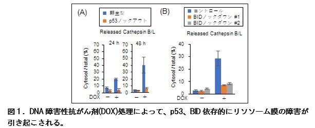 図1.DNA障害性抗がん剤(DOX)処理によって、p53、BID依存的にリソソーム膜の障害が引き起こされる。