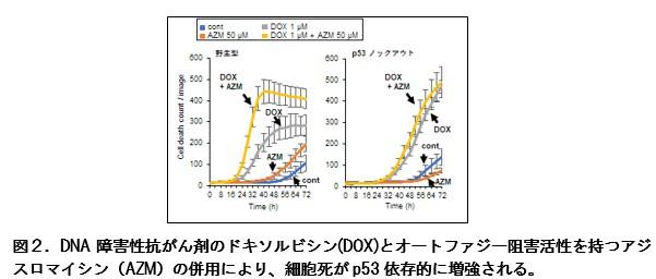 図2.DNA障害性抗がん剤のドキソルビシン(DOX)とオートファジー阻害活性を持つアジスロマイシン(AZM)の併用により、細胞死がp53依存的に増強される。