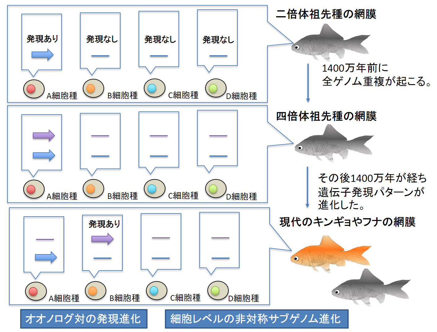 ●キンギョの網膜において、全ゲノム重複後の1400万年という比較的短い時間に306ペアの遺伝子対が新たな発現パターンを獲得したことが明らかになった。