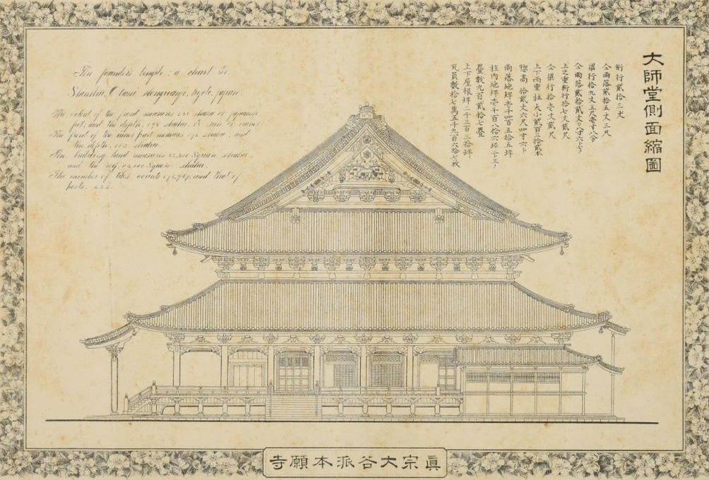 今回の企画展では、世界最大級の伝統木造建築とされている宗祖親鸞の木像を安置する御影堂(ごえいどう)の再建に関わる史料なども展示。「御影堂上棟式概図」「御影堂瓦ノ数及寸法図(部分)」など、50点を観ることができる。