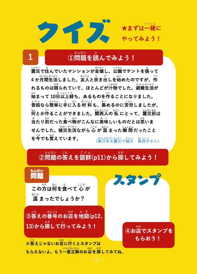 防災に関するクイズを解きながら、商店街の店舗をスタンプラリー形式で巡回する企画です。まず参加者は、過去の災害で被災した方のエピソードを読みながら、そのエピソードにまつわる「モノ」を予想します。参加者は、予想したモノを販売している商店を探して訪問し、正解であればそこでスタンプを獲得。6つある問題すべてに正解し、それらを扱っているすべての商店でスタンプを得ることができればゴールとなります。