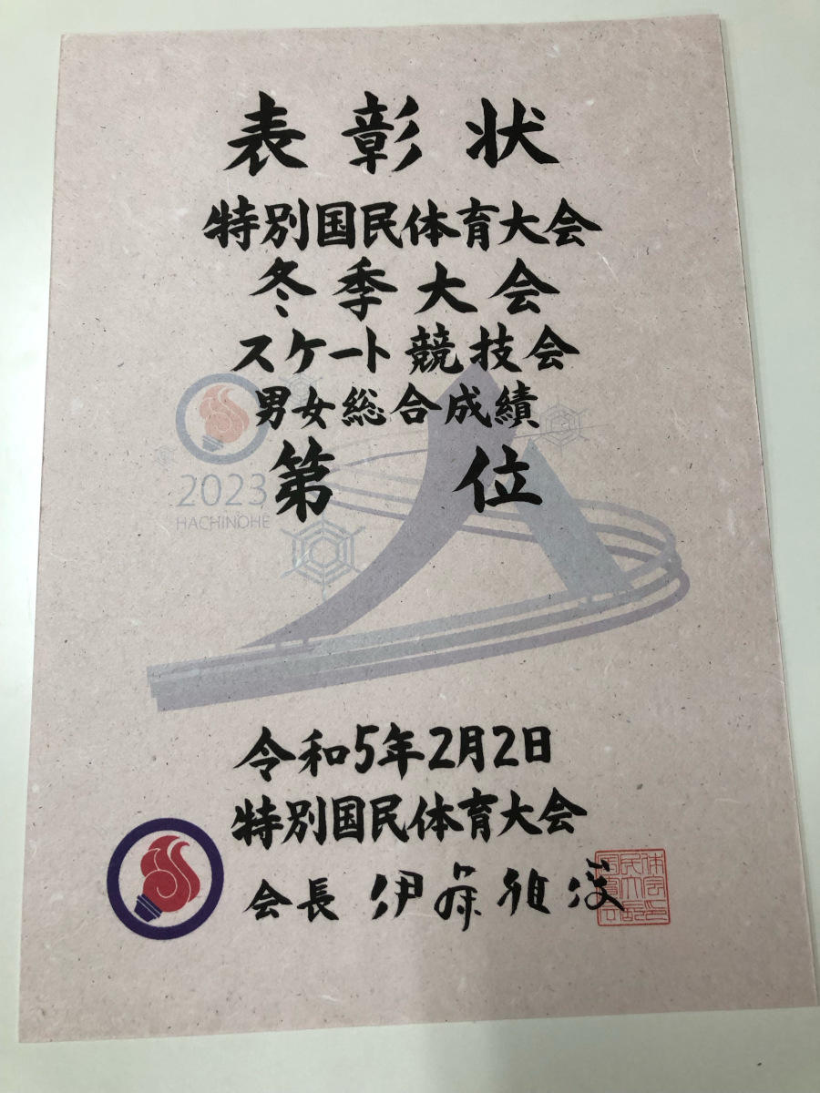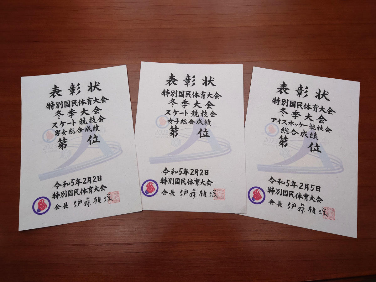 「りんご剪定枝和紙」を使った表彰状は、スケート競技会の男女総合、女子総合、アイスホッケー競技会総合の3種目の1位~8位に授与される。