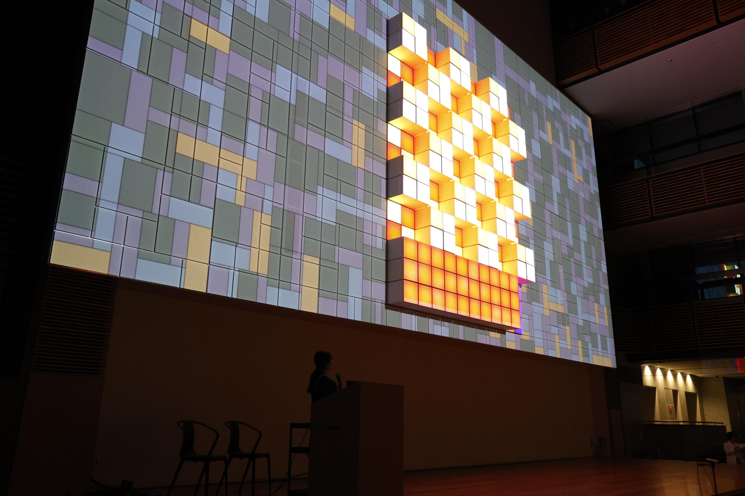 キネティックウォールのキューブの動きを大胆に使ったジェネラティブアートを制作。タイトルの由来にもなったユークリッド互除法のアルゴリズムを使い、LEDで彩られた壁面が次々に分割され形を変えていく様子に、会場中が惹きつけられました。新宿の一日の移り変わりをイメージして、時間帯によって色彩に変化をつけました。