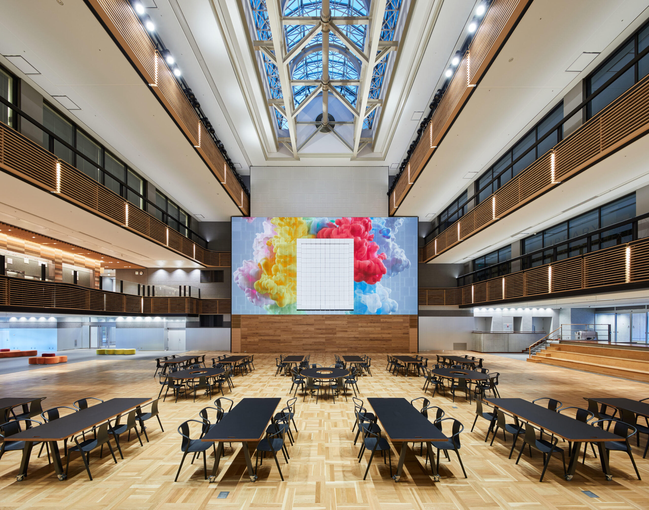 高さ12.8m、幅16mの巨大4Kスクリーンに可動キューブがうごめくキネティックウォール(常設 国内初※)を備えた、多目的学園ホール。映像・音響・照明を組み合わせた多彩な演出表現が可能で、教育、式典、学術利用のほか、音楽、アート活動まで幅広く利用されています。 ※ 常設設備として国内初 2022年12月現在