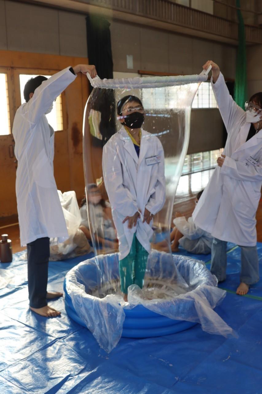 去る12月10日(土)に同小で実施されたイベントでは、熱気球が浮く仕組みや人が入れるシャボン玉、LEDの原理や仕組みなどを体験する「科学実験教室」、LEDを点灯しヘリウムで浮遊させる、100個以上の熱気球使った「LEDスカイランタン」、蓄光剤を利用した「夜のサイエンスショー」などを行いまいた。この取り組みでは、小中学生と大学生がオンラインで議論して企画を行い、科学の面白さを感じてもらえる実験の演示方法やわかりやすい説明方法を事前に検討するなど、サイエンスコミュニケーターとしての素養を身につける機会を創出しました。また同小中学校PTAとは今後もICTを活用した実験動画の配信や自由研究の相談といった継続的な連携も図ります。
