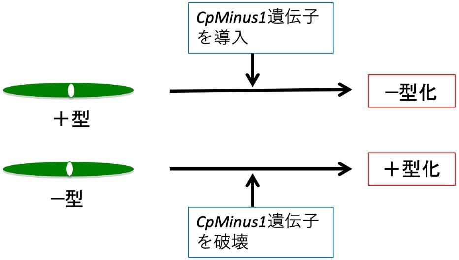 ヒメミカヅキモの二つの接合型に対応する二つの系統株(NIES-67: +型, NIES-68: −型)の概要ゲノム配列(約3億6千万塩基対および3億4千万塩基対)を決定し、−型の子孫には遺伝するが+型の子孫にはない配列(約2百万塩基対の領域)を同定し、-型のゲノムの中に候補遺伝子を見出しCpMinus1と名付けました。この遺伝子をNIES-67株(+型)に導入すると、NIES-67 (+型)と接合するがNIES-68 (−型)とは接合しないという様に−型として振る舞うこと、また、NIES-68株にあるCpMinus1をゲノム編集技術によって破壊すると+型として振る舞うことが分かりました(図3)。このことから、CpMinus1が接合型をほぼ単独で決定する遺伝子であることが分かりました(図4)。