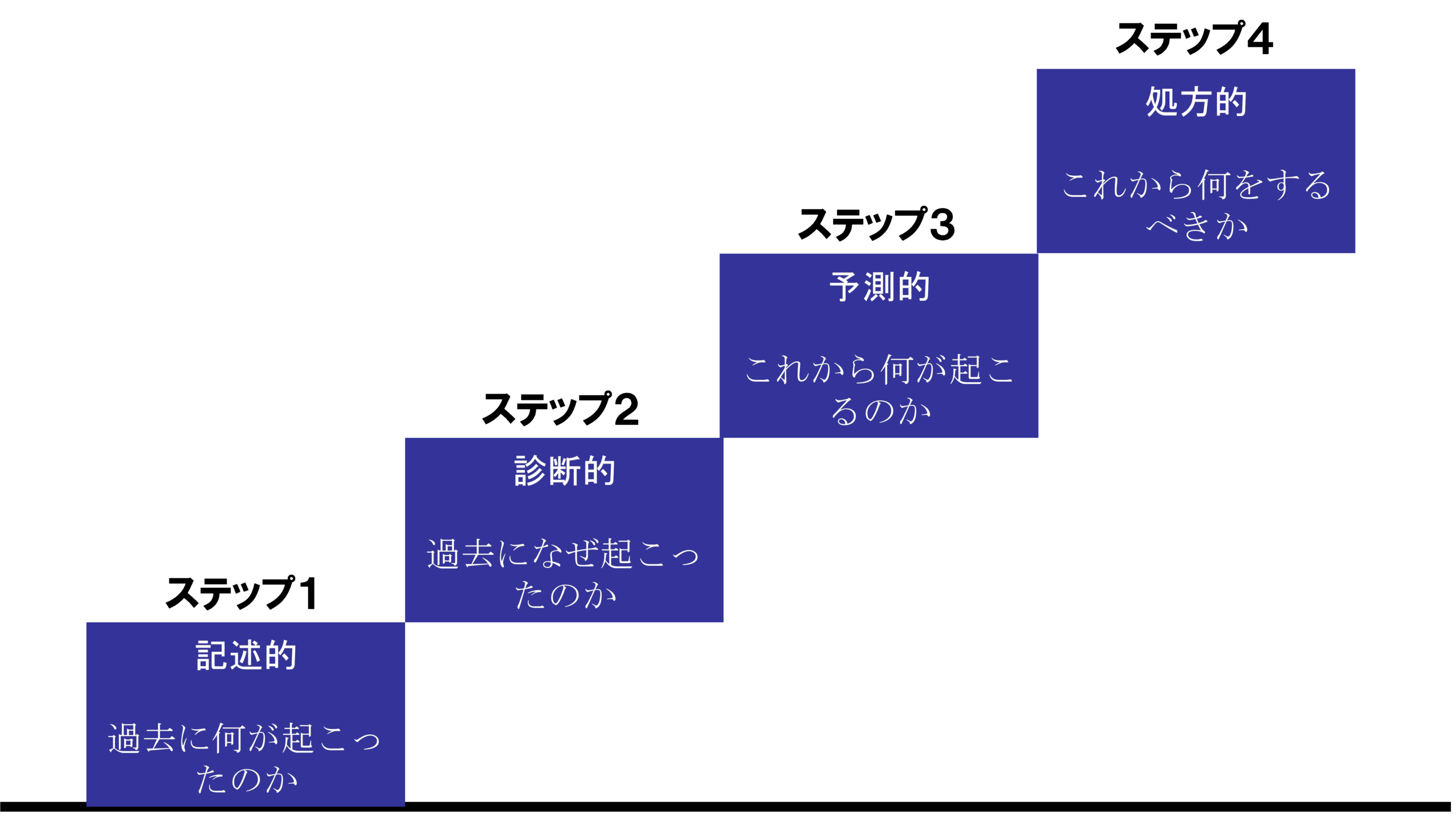 本ゲームでは、データサイエンスやプログラミングは手段であり、目的を明確にすることが大事というメッセージを強調していますが、プレイ後にデータサイエンスの基礎的な考え方を学べる要素が盛り込まれています。例えば、ゲーム中に生活・ビジネスシーンをアップデートすると、新たなデータ・予算を獲得することができますが、その際に獲得できるデータ量はアップデートされた生活・ビジネスシーンで用いられたデータの加工段階に基づいて決められています。データ分析においては、(1)記述的(過去に何が起こったのかを理解するために用いられ、単純にデータをさまざまな切り口で記述したもの)、(2)診断的(過去になぜそれが起こったのかを明らかにする)、(3)予測的(これから何が起こるのかを推測する)、(4)処方的(これから何をするべきかを知る)という4つのステップでより価値の高いデータへと加工されていきます(最終的に意思決定を自動化する「認知的分析」を含め5ステップとする考え方も存在します)。