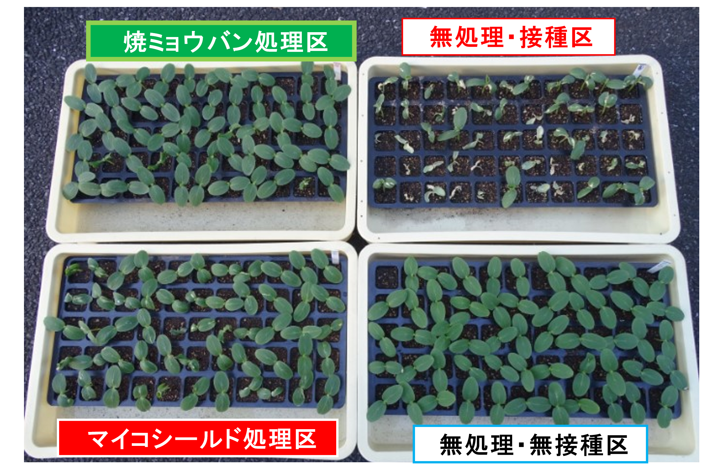 本研究による防除例として、糸状菌病ではイネいもち病、イネばか苗病、イネ苗立枯病、イネごま葉枯病などに対して、既存の化学農薬および生物農薬に比較して、同等または優れた防除効果を示しています。細菌病では、ハクサイ軟腐病、キュウリ斑点細菌病、イネ苗立枯細菌病、イネ褐条病などで同様の結果を得ています。上記の病気は、すべて現場で問題となっている防除が難しいものです。