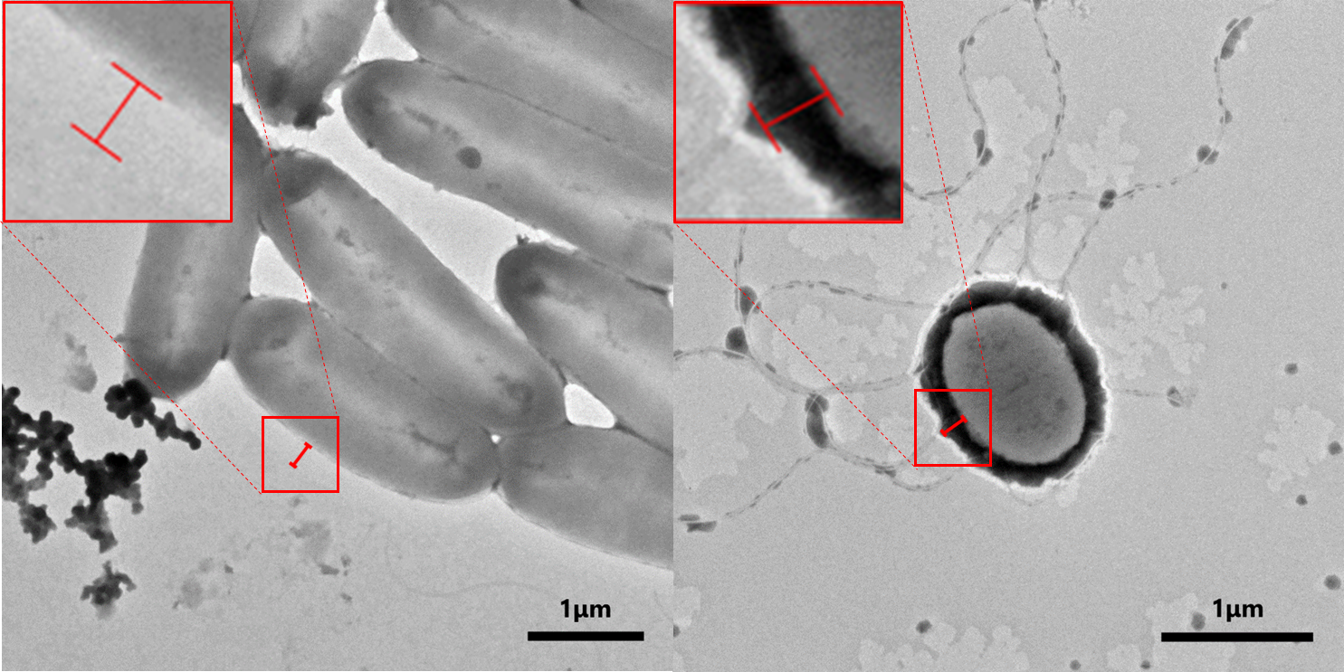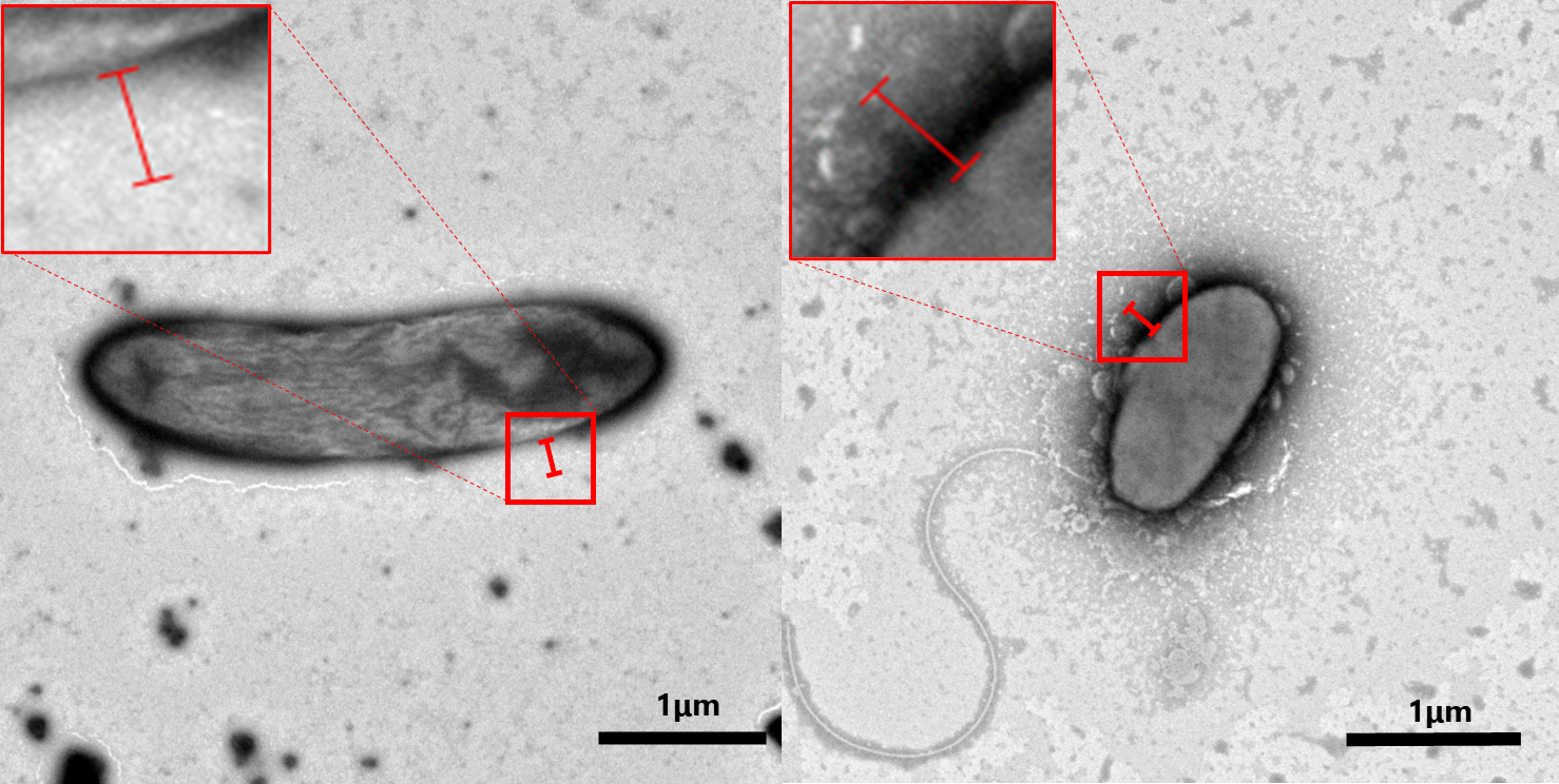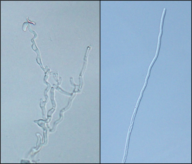 本物質の防除メカニズムを解説します。本物質処理により、病原糸状菌に対しては、菌糸の異常分岐、分生子(胞子)の発芽抑制、付着器の奇形などを生じさせ、生育を抑制します(写真3,4)。病原細菌に対しては、細菌外膜を損傷させ、増殖を抑制します(写真5,6)。