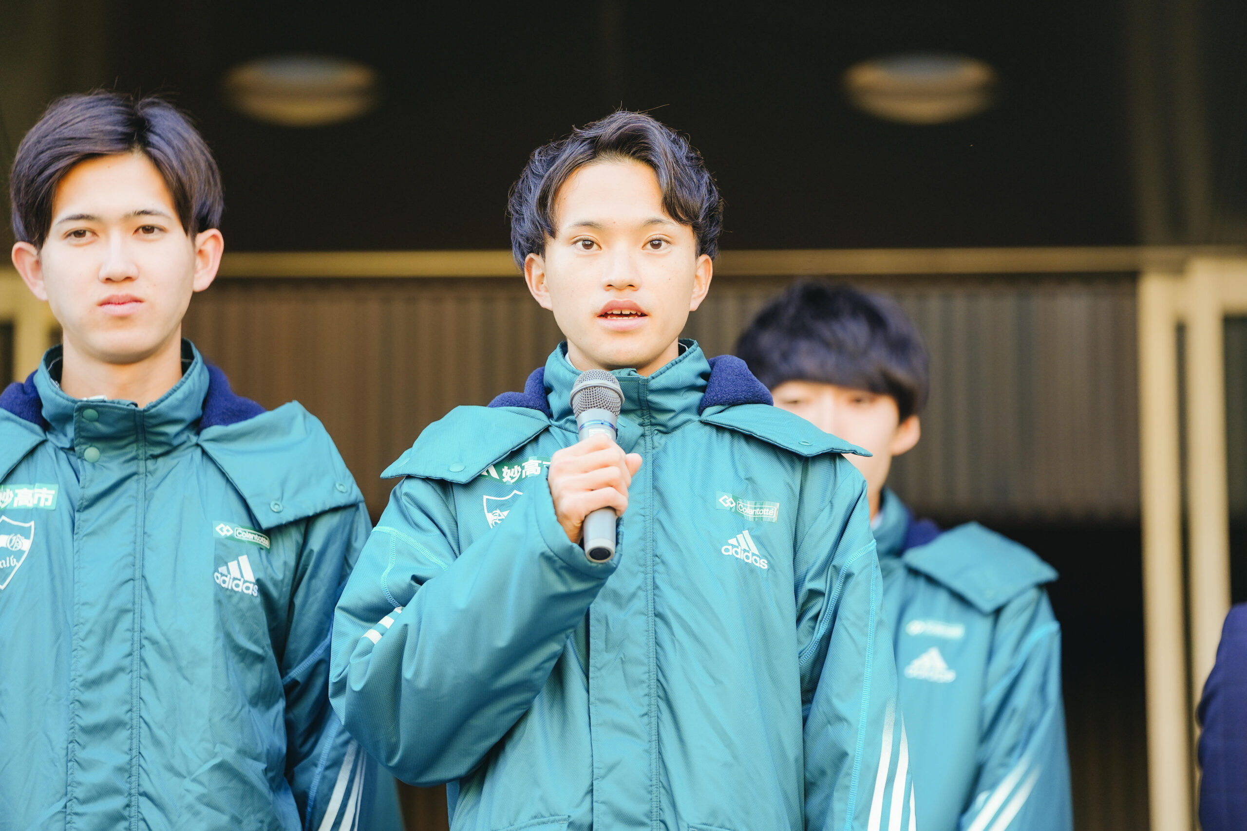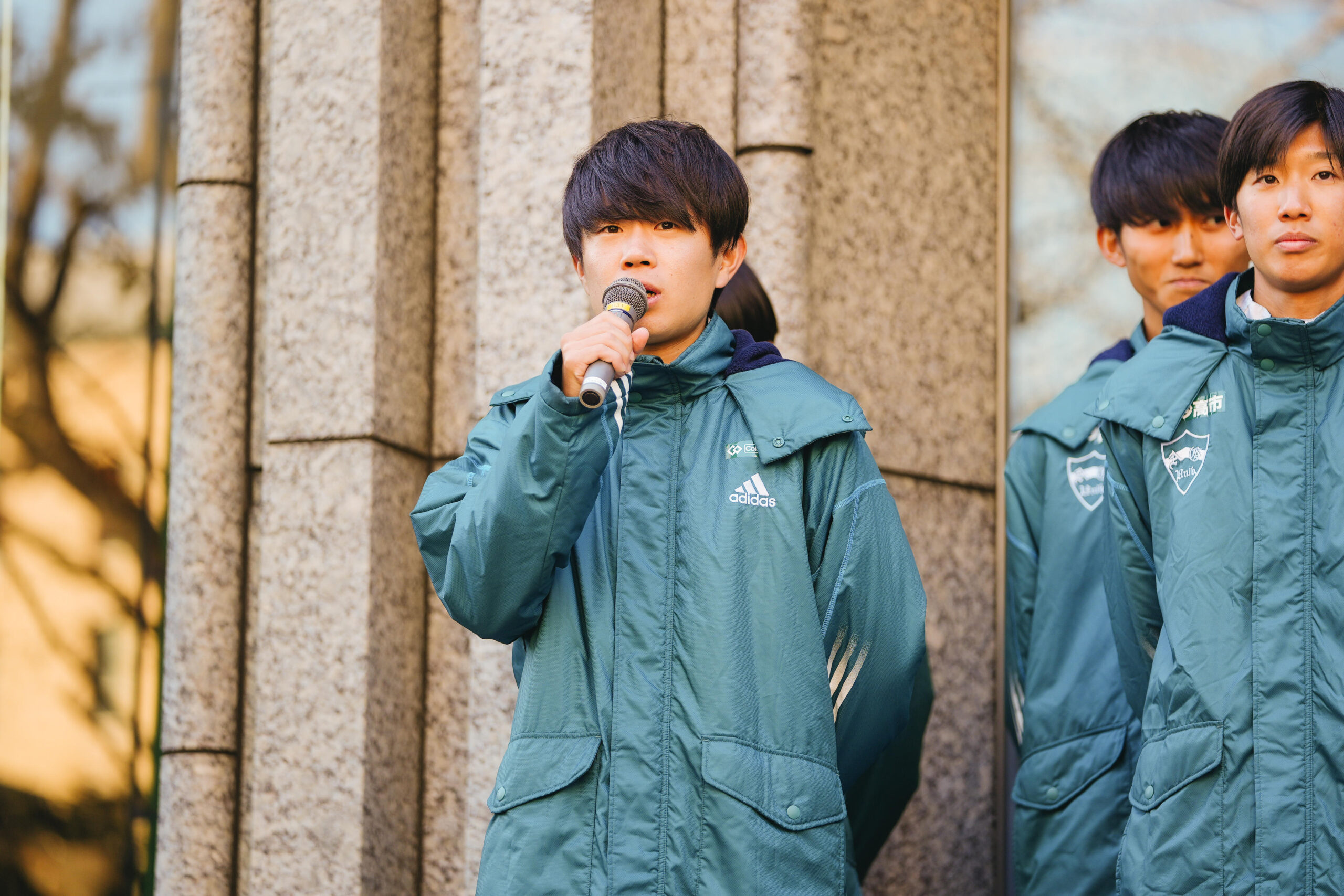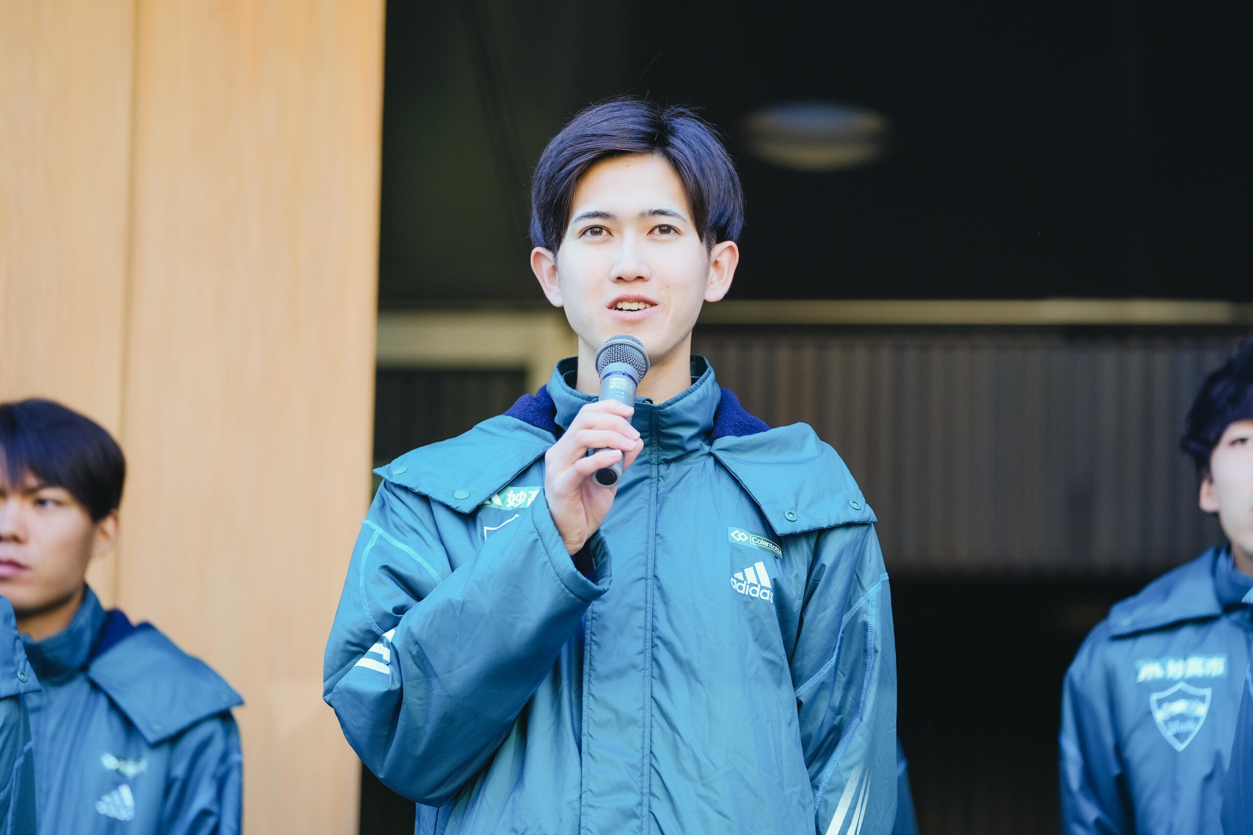 また、柳田武好「箱根駅伝を応援する会」会長から激励の言葉をいただいた後、宮坂主将が選手を代表して「今年はチームの選手層の厚さから、私自身は力が及ばず登録メンバーに入ることができませんでしたが、主将として、優勝という目標に向かって全力でサポートします。チーム一丸となって頑張りますので、テレビ・ラジオを通じての応援をよろしくお願いします。」と決意を語った。 最後に応援団と吹奏楽バトントワリング部がエール、カレッジソングを演奏し、閉会となった。