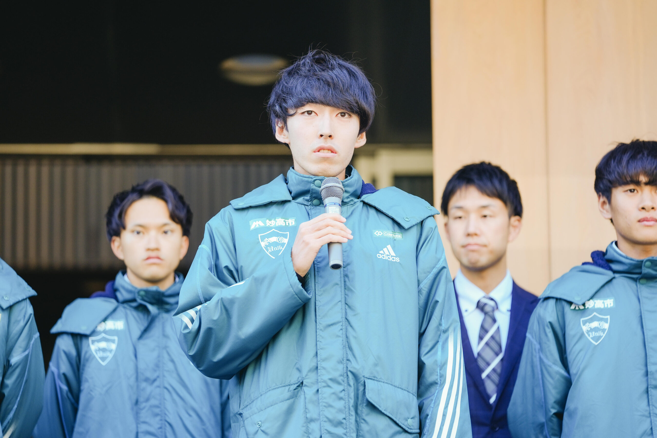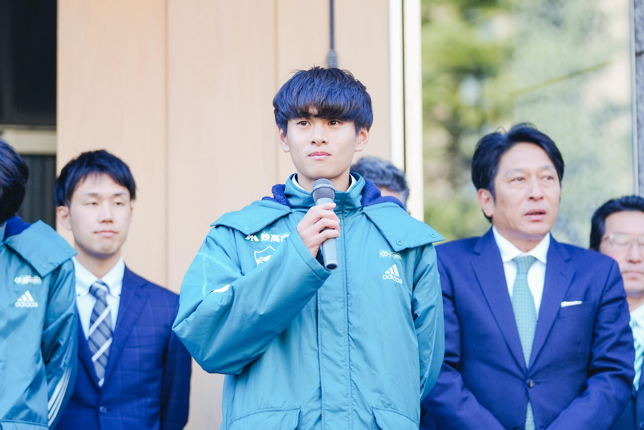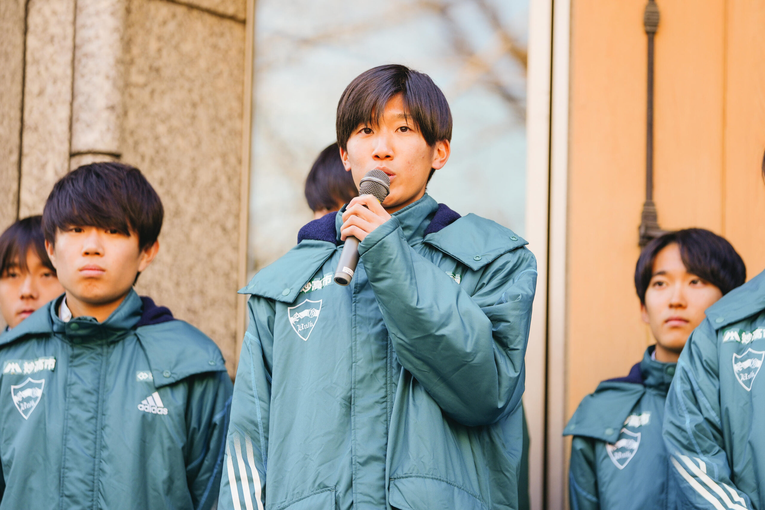 また、柳田武好「箱根駅伝を応援する会」会長から激励の言葉をいただいた後、宮坂主将が選手を代表して「今年はチームの選手層の厚さから、私自身は力が及ばず登録メンバーに入ることができませんでしたが、主将として、優勝という目標に向かって全力でサポートします。チーム一丸となって頑張りますので、テレビ・ラジオを通じての応援をよろしくお願いします。」と決意を語った。 最後に応援団と吹奏楽バトントワリング部がエール、カレッジソングを演奏し、閉会となった。