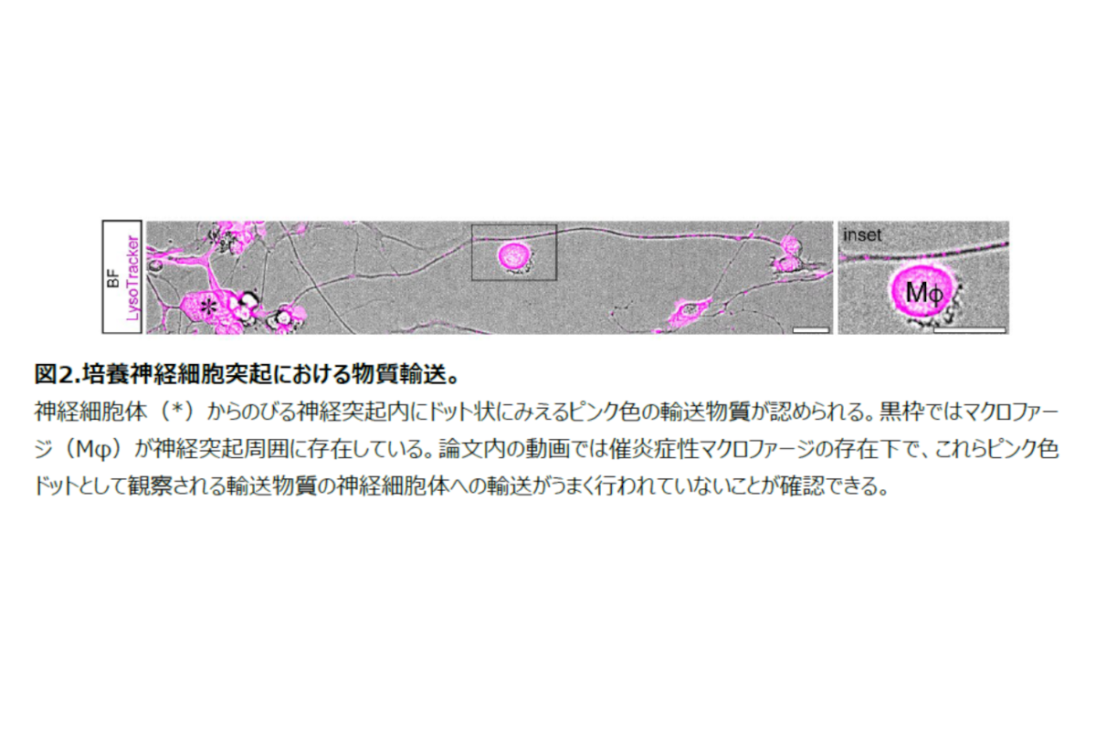 さらに、この末梢神経における物質輸送機能の低下の発見にあたり、生きたままの培養感覚神経細胞を動画で観察するライブイメージングという新しい技術が用いられました。ライブイメージングでは、物質輸送を経時的に動画で見ることができます。催炎症性M1マクロファージと神経細胞を一緒に培養することにより、神経細胞突起における末梢から細胞体への物質輸送機能の低下が確認されました(図2)。