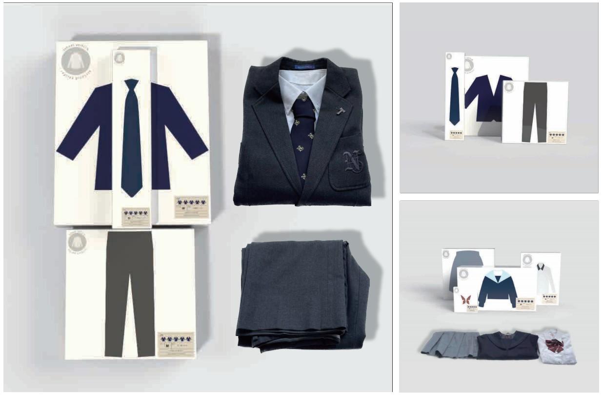 作品コンセプト:リサイクル制服を次世代に繋ぐパッケージを考えました。制服を全て揃えるのは高価でかつ資源の無駄な消費にも繋がっています。制服一つ一つを単品での販売を可能にすることで消費者により安価な状態で制服を揃えることができ、資源の消費を抑えることができます。また、リサイクル商品は汚いなどのイメージを持っている方もいるためパッケージングの状態から既に制服が見える状態でのパッケージデザインにしました。また制服パッケージの右下のスタンプには制服の品質を5段階で示している服のマークと制服の情報を消費者に一目で理解できる記載方法を考えました。