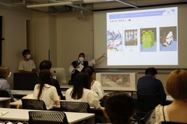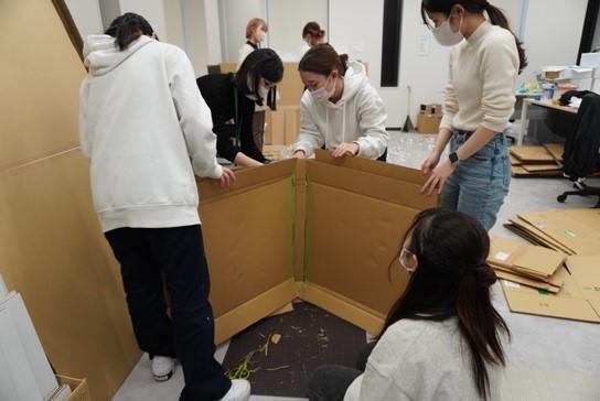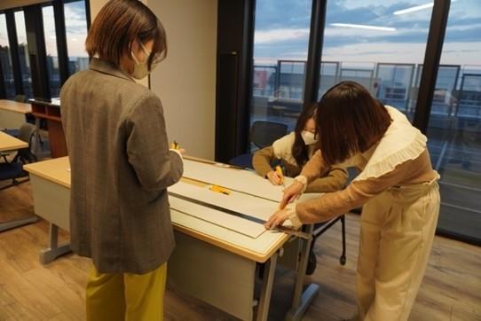 学生の指導には芸術学部の林三雄教授と堀場絵吏講師が当たっています。7月から活動がスタートし、現地調査やSDGsについて考えを出し合い、夏休みにデザイン検討を各自行いました。デザイン案は一人一つ持ち寄り、類似性のあるものでグルーピング。そこから議論を重ね、融合した案を出していきました。授業内投票で選ばれた2案を町田マルイ担当者の前でデザインコンセプト、ポスターデザイン等のプレゼンテーションを行いました。本来は1案を選出してディスプレイ制作に挑む形でしたが、町田マルイ担当者に学生の熱い想いが届いたことで2つの案を実施することに決定しました。現在はそれぞれのチームがフィードバックを受け試行錯誤し、各担当を決め制作に取り組んでいます。