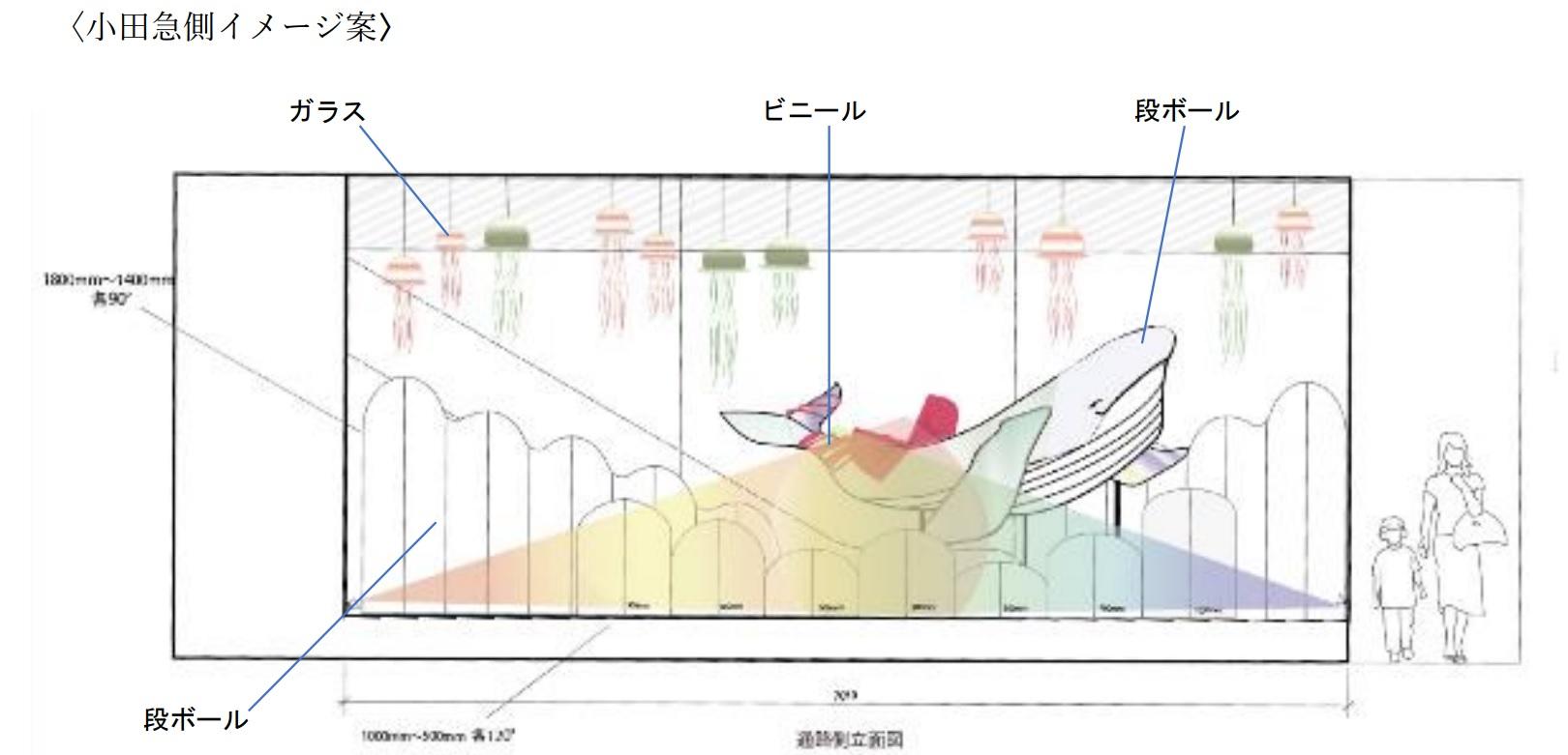 中央にあるクジラの造形は、再生可能な段ボールを使用。尾びれには海洋プラスチックごみをイメージしたビニールやリボンが巻かれています。ビニールやリボンは、頭部に行くにつれ解かれていますが、これはごみから解放され「自由」に向かっているクジラを表現しています。
