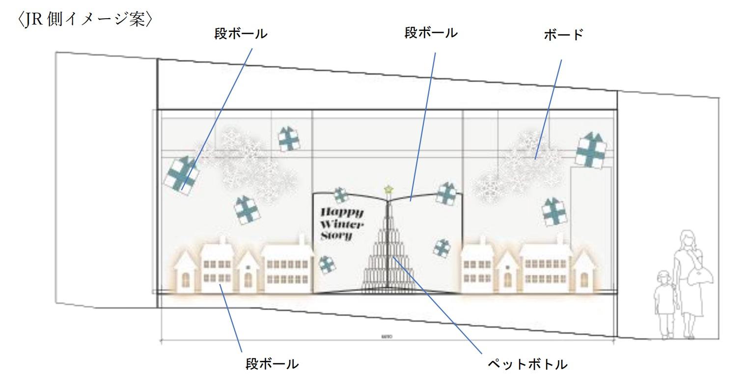 JR側のコンセプトは「冬からの贈り物」です。開くと驚きとワクワク感を感じられる飛び出す絵本をモチーフに一冊の本からツリーや家、プレゼントが飛び出したデザインになっています。見た人の心が暖かく、そして「冬からの贈り物」を受け取り幸せな気持ちになれる展示を目指し制作してきました。