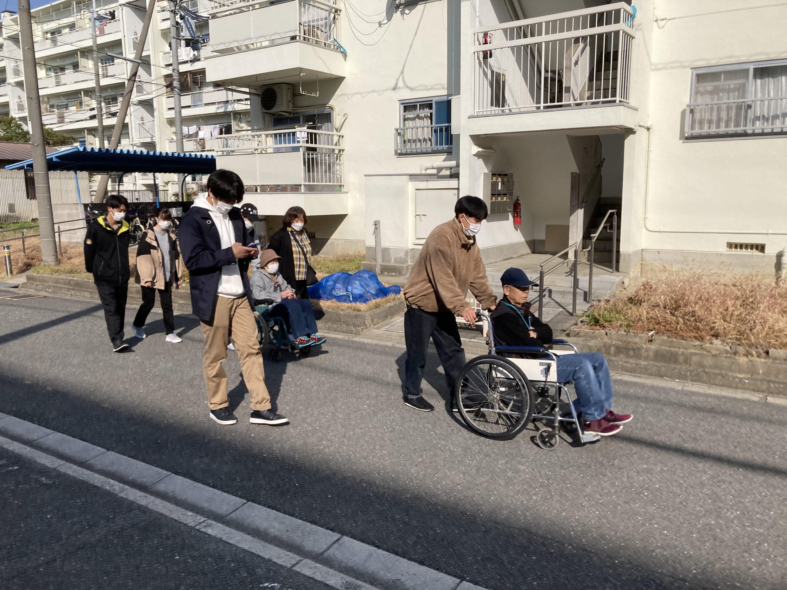 足の弱った住民と共に数百m先のスーパーまで車椅子で買い物に行く。